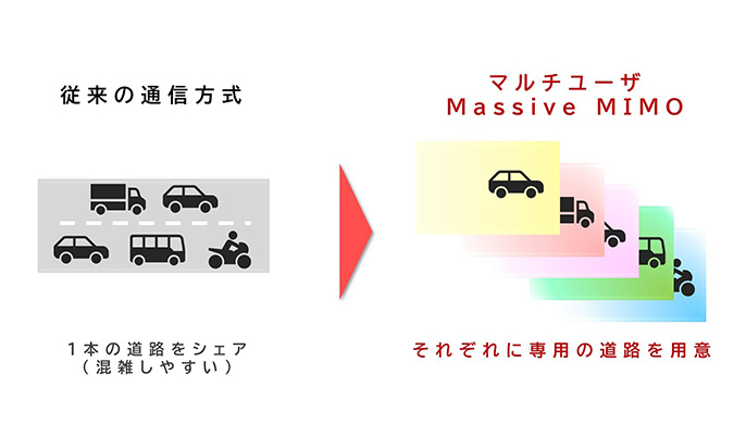 「金沢ゴーゴーカレースタジアム」のネットワーク対策について検討を重ねた結果、最新の5G技術である「マルチユーザMassive MIMO」を導入することにしました。この技術は、多数のアンテナによって一人ひとりのユーザーに高品質なエリアと専用の周波数リソースを提供することで、混雑時でも安定した通信が可能となります。