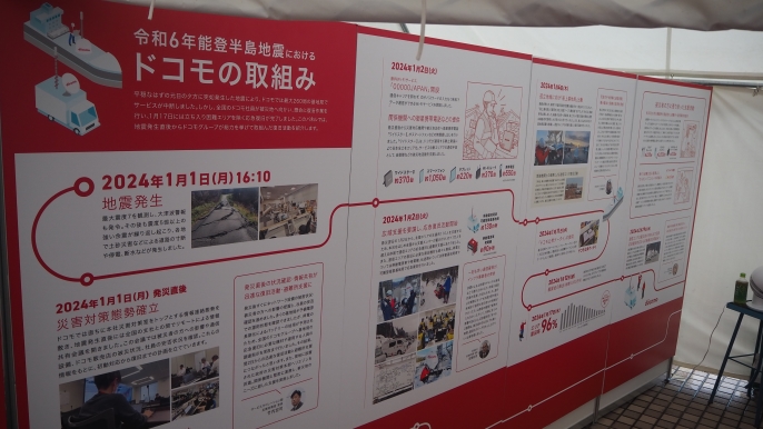 「ドコモの復興支援ブース」では、応急復旧活動を紹介したパネルの展示、被災地で活用したマルチチャージャーによるスマートフォンの充電サービス、石川県と連携した被災自治体のふるさと納税の案内などを行いました。引き続き多角的な活動を通じて、一日でも早い復興に向けた被災地支援を継続していきます。