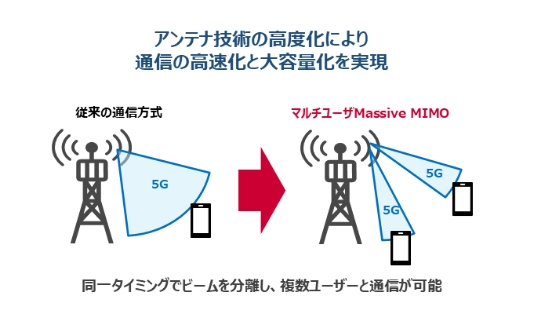 通信品質の改善に向けて導入したのが、新しい5G技術「マルチユーザMassive MIMO」です。マルチユーザMassive MIMOは、従来の基地局アンテナよりも広いエリアをカバーでき、かつ一度に送受信できるデータ量を飛躍的に増加させることが可能な技術です。さらに、ユーザーごとに電波を個別に割り当てることで、混雑時にも安定した接続を提供できるという利点があります。