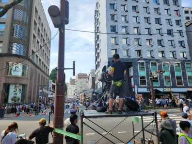 舁き山笠(かきやま)の迫力を真正面から撮れるベストポジションですが、カメラと放送局をつなぐ中継車が少し離れた冷泉公園(れいせんこうえん)付近にあるため、中継車からカメラに引いてくるケーブルは幹線道路をまたがなければいけません。これまでは深夜に突貫で横断歩道の頭上にケーブルを通しており、高所作業に危険が伴っていました。また、福岡放送(FBS)さまとしても新しい技術に積極的にチャレンジしたいという想いがあり、5Gを活用した無線化に向けて協働を進めてきました。