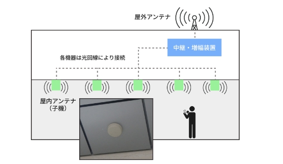 協議の結果、仙台駅への導入が決まったのはIMCS(インクス、Inbuilding Mobile Communication Systemの略)というシステムです。屋外でキャッチした電波を施設内で増幅し、天井に取り付けた子機を通して屋内に電波を供給します。子機は非常に小型のアンテナなので施設内の景観を損ねることもなく、ビル内や地下街において多くの設置実績があります。