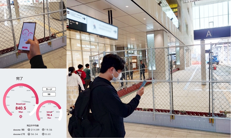 事前に入念なエリア調整を行い、2025年3月に開業を迎えましたが、トラフィックが分散され受信環境も強いことが確認されました。路面電車乗り入れエリアでの実測調査ではダウンロード840Mbps、アップロード78Mbpsと、高品質な通信環境を実現しています。これは、周辺の5Gの平均値と比較してアップロード・ダウンロード速度は約4倍高速になっています。
