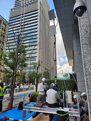 1つ目の難所は、高層ビル群に囲まれた「大手町」。スタートやフィニッシュの瞬間をおさえるために、多くの観客が一斉にスマートフォンを利用することで通信が混雑しやすいエリアです。ドコモは、このエリアでより多くの通信を処理するための新しい基地局の建設を進めていました。しかし、高層ビルが密集するオフィス街における設置場所確保の難しさなどにより、大会本番までに建設が間に合わない可能性が浮上。そこで、本番までの限られた期間で十分な通信容量を確保するために2つの対策を実施しました。まず、フィニッシュ地点にピンポイントで可搬型の仮設基地局「キャリー5G」を設置。本来、ビルが立ち並ぶ大手町での設置場所確保は困難を極めますが、予選会を通じて大会運営側と築き上げた強固な信頼関係があったからこそ、スムーズな連携と場所の確保を実現することができました。さらに、周辺にある既存の基地局や仮設基地局「キャリー5G」には、混雑時でも多くの人が同時に接続できる「マルチユーザMassive MIMO」という最新のアンテナ技術を導入。基地局の頭脳にあたる装置により処理能力の高いものを搭載するなど、徹底的な機能強化を行いました。時間がないなかでも、"考えられる最善の手をすべて打つ"という強い想いにより、必要としていた通信容量を上回る環境の構築につながりました。