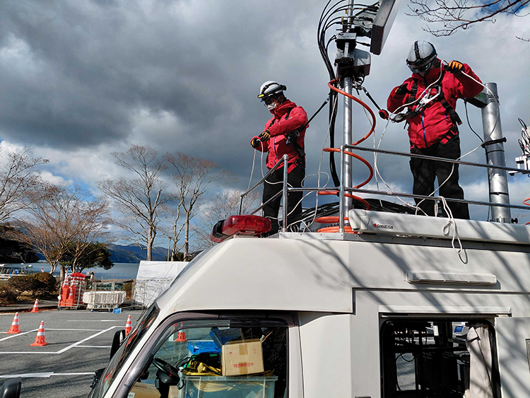 2つ目の難所は、山間部に位置する往路フィニッシュ・復路スタート地点「芦ノ湖」。ここは山間部特有の電波の届きにくさに加え、当日は多くの観戦客や関係車両で埋め尽くされるため、基地局車を設置できるスペースが極端に少ないという課題がありました。まず、設置場所を確保するために、現地に何度も足を運び、関係各所とのていねいな話し合いを重ね、ようやく場所を確保しました。その限られた場所から、より多くの人に電波を届けるために立てられた対策方針は"2倍の力で山を制す"こと。配置したのは、第101回大会と比較して設備容量が約2倍の能力を持つ特別車両です。これにより、関係者が集まる駐車場だけでなく、沿道で応援する観戦エリアまで広くカバーすることに成功。多くの人が集まる山間部においても、ストレスなく感動を共有し合える快適な通信環境を提供することができました。