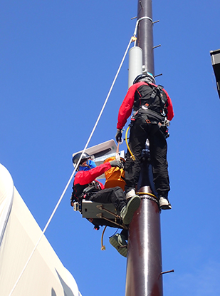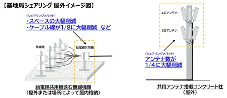 限られたスペースのなかで、快適な通信環境を実現するために導入したのが、シェアリング基地局です。これは通信キャリアの垣根を越えて共同で基地局設備を利用する取組みで、通常は屋内の限られた空間で採用することが多いのですが、屋外で全キャリアが共同利用するのは、前例のない取組みでした。この取組みにより、限られたスペースに各キャリアが効率的に通信設備を設置し、十分な通信環境を確保できるようになりました※2。