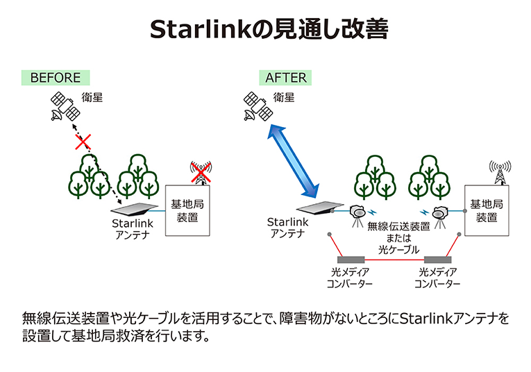 こうした課題に対し、全国の現場から生まれたアイデアをもとに、今回の訓練では、伸縮ポールを使ってアンテナを高い位置に設置する方法や、光ケーブルや無線伝送装置を用いてアンテナ設置場所から離れたエリアまで信号を延長する方法などを検証しました。アンテナを設置できる場所の自由度を高めることで、Starlinkを使った通信復旧ができる状況を増やすことができます。これらの工夫は、今後、全国共通のノウハウとして活かされていきます。