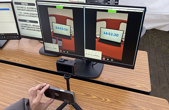 道路の崩落や避難所の混雑度など、言葉だけでは伝えきれない現場の状況を本部が素早く把握するには「映像」が有効です。そこで、避難所側のカメラから現地の映像を対策本部へ送るテストも行いました。あえて回線が混み合う状態をつくると、通常の通信では映像の遅延や一時停止がみられました。しかし、「ネットワークスライシング」を使った映像は、安定していて滑らかでした。現地の映像がほぼリアルタイムで届く様子に、現場の担当者からも「理屈だけでなく、目に見える形で違いを確認することができた」と手応えの声が上がりました。
