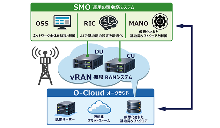 こうしたvRANやO-Cloudの動作を最適化する役割を担うのが、「SMO」です。SMOとは、主にOSS/MANO/RICといった制御部から構成され、各制御部がvRANやO-Cloudの運用状況を管理・制御することでネットワーク全体のオーケストレーションを行う、運用の司令塔のようなシステムです。