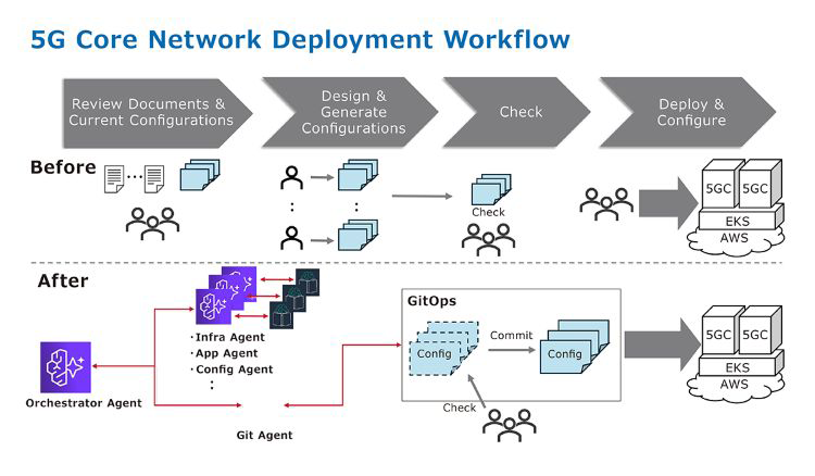 具体的には、5Gコアネットワークの土台である基盤の設定値を決定する担当、アプリの詳細な設定値を決定する担当など、それぞれの分野に特化したAIエージェントが存在します。そしてこれらを束ねる司令塔役の「オーケーストレーターAIエージェント」が全体を統制することで、基盤作りからアプリの設定まで、正確な設定値が自動で生成されます。