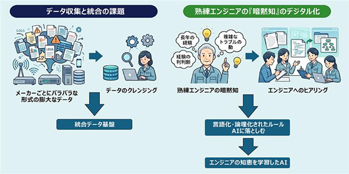 最初に立ちはだかったのは、データの壁です。メーカーの異なる100万台以上のネットワーク機器から集まるデータは、形式がバラバラで、そのままではAIに読み込ませることができません。エンジニアたちは、AIに正しい学習をさせるために不要なデータを取り除き、ひとつの形式に整える「クレンジング」という作業を実施。約4年もの歳月をかけて積み重ねることで、ようやく分析の土台となる統合データ基盤を築き上げました。