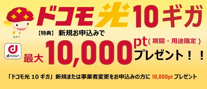 - 「ドコモ光 10ギガ」新規または事業者変更をお申込みの方:dポイント(期間・用途限定)10,000pt