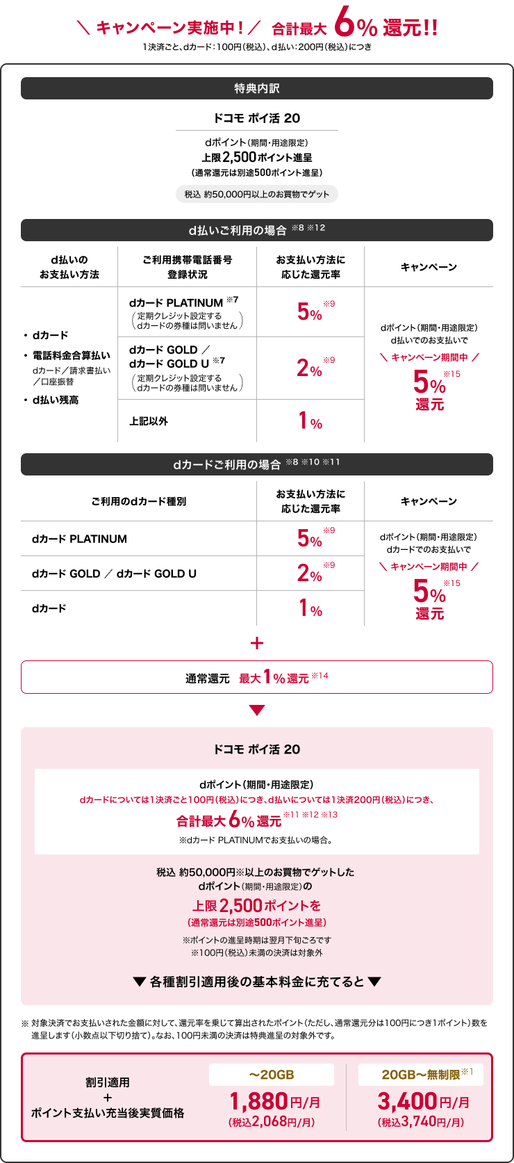 1決済ごと、dカード:100円(税込)、d払い:200円(税込)につき