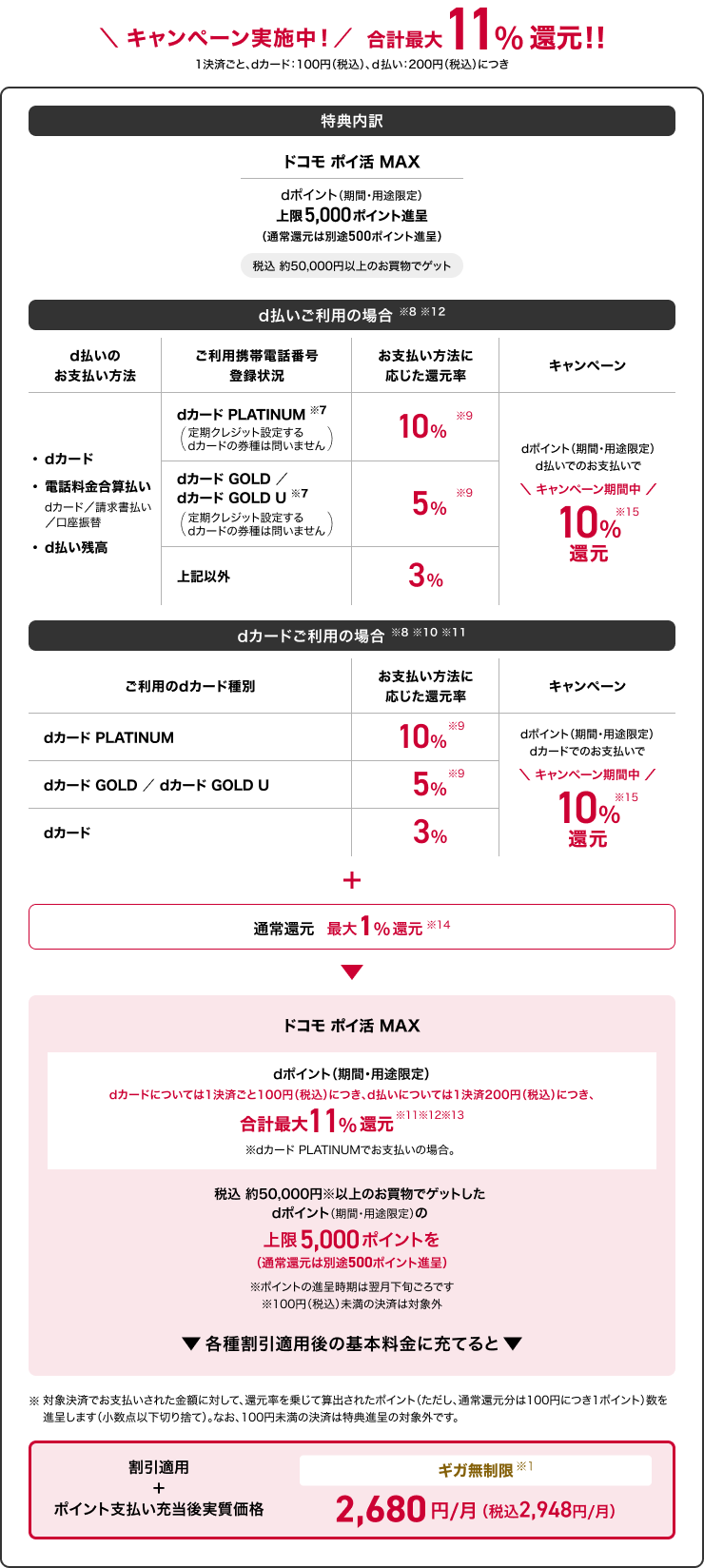 - 対象決済を行った日において、ご利用のdカード/dカード GOLD U/dカード GOLD/dカード PLATINUM(本カード/家族カード)に本料金プランを契約している回線のご利用携帯電話番号が設定されていることが必要です。