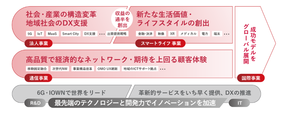 5Gの早期拡大と、ドコモとコミュニケーションズ※のネットワーク機能統合により高品質で経済的なネットワークを実現し、低廉で使いやすい移動・固定サービスを提供します。そして、多様なニーズに応える料金・サービスと販売チャネルの変革をパートナーとともに実現し、期待を上回る顧客体験を創出します。これらの取組みにより、「顧客基盤の拡大」と「販売・ネットワークコストの最適化」の構造改革を実現し、通信事業の中期的な利益維持・成長軌道への転換を図ります。