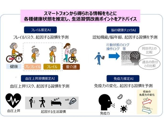 アプリの利用者は普段どおりにスマホを使うだけ。フレイル(加齢に伴い心身が弱った状態)や、免疫力、脳の健康など、多様な健康状態をAIが推定し、「最近歩数が少なくて少々引きこもりがち」「寝る時間が遅い」などの健康によくない生活習慣に対して利用者に気づきを与え、具体的な数値目標とともに改善アドバイスを個別に提供します。
