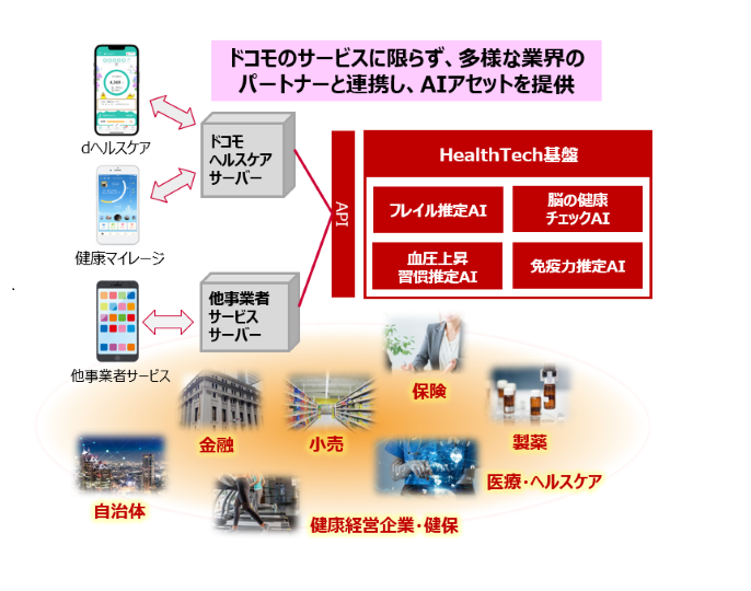 加えて、各種AIを集約・搭載したAPI基盤として「HealthTech(ヘルステック)基盤」も開発しました。APIとは、サービスと外部システムをつなぐもので、この共通インターフェースによりドコモのサービスに限らず、パートナー企業のみなさまも私たちの開発したAIを簡易に外から接続して使うことができるようになりました。