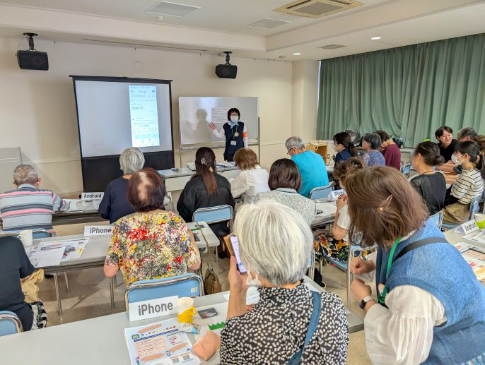 参加者の中心は70代で、80代も多く参加されています。スマホの持つさまざまなサービスがどれだけ生活を豊かにするか、受講とともに多くの方々が実感しているようです。