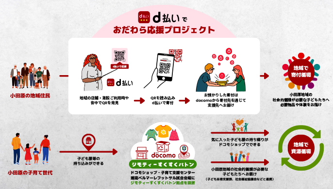 第一弾として、支援が必要な小田原の子どもたちを応援できる「d払い」募金と、サイズアウトした子ども服を次の子どもたちへつなぐ「ジモティーすくすくバトン」を開始しました。