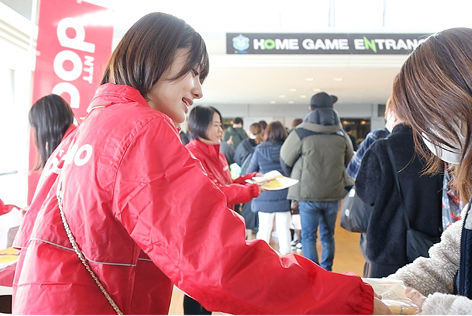 グッズ売り場やフットサルのパフォーマンスブースが並ぶ一画、試合前の熱気ある会場で、「一緒に小田原を応援しましょう!」とお伝えしたところ、小さなお子さん連れのファミリーから、おじいちゃん・おばあちゃん世代の方までそれぞれに興味を持っていただきました。その場で「d払い」募金をされる方、大きな拍手をくださる方々を目にし、このプロジェクトを大切に推進していこうと、あたたかい気持ちになりました。
