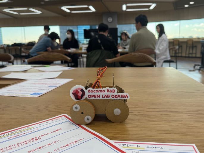 今回のイベントは、東京(docomo R&D OPEN LAB ODAIBA)と大阪(QUINTBRIDGE)という2つの会場をIOWNでつなぎ、遠く離れた会場にあるお互いのプログラミングロボット embot(エムボット)を遠隔で操作したり、ロボットプラグラミングを通してゲームのアイデアを考案し発表し合う「未来の授業」を体験いただきました。
