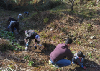 また集積場では腐葉土の中でカブトムシ・クワガタの卵や幼虫が生育されており、里山で腐葉土の材料となる落ち葉を集め運びました。作成したシイタケの榾木も、シイタケの収穫が終わるとクワガタの幼虫の餌として活用されるとのことです。