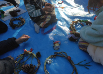 X’masリースづくりチームは、みんなでワイワイ、あーだこーだと言いながらツル取りから始まり、飾りつけを行いました。