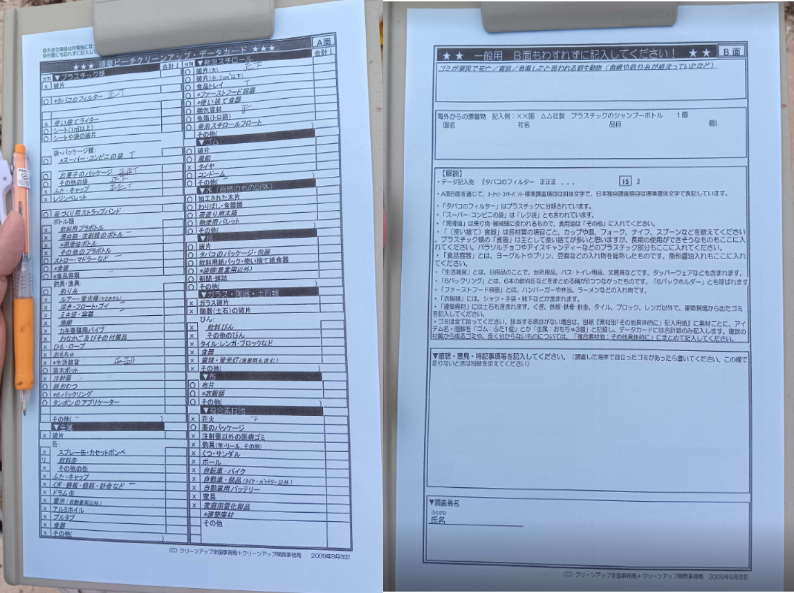 台風の影響か、相当量の漂着ごみがありました。それらを細かく分類し、調査票に記入していきます。