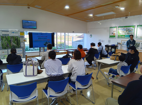 はじめに響灘ビオトープのスタッフの方による座学で「ベッコウトンボ」について学びました。ベッコウトンボは絶滅の危険度が最も高いIA類に指定されており、日本全国5県でしか見ることができません。北九州市響灘ビオトープはベッコウトンボの貴重な生息地となっています。