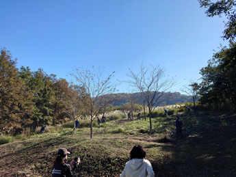 現地では、まず植樹の方法について説明を受け、その後、それぞれの担当エリアへと移動しました。植樹の地点にはあらかじめ穴が掘られ、そばには約3メートルの桜の苗木が準備されていました。苗木をそのまま植えると深すぎるため、根腐れを防ぐために床土を盛り上げた上で植樹しました。