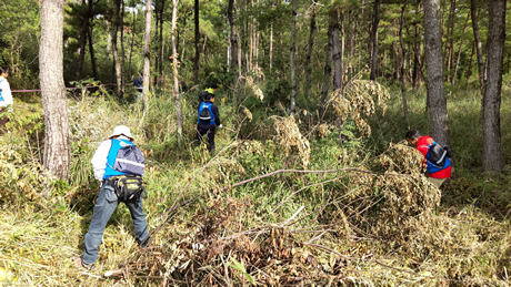 新たな取り組みだけでなく、従来より実施していた保全活動も重要な取り組みです。2名のOBにも参加いただき交流を図りながら、鎌を使いながらススキや雑木などを取り除きました。