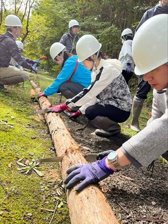 第二部のフィールドワークでは、希少植物や生物の観察に加え、森林を健全に育てるための間伐作業や遊歩道整備用の丸太づくりを体験しました。