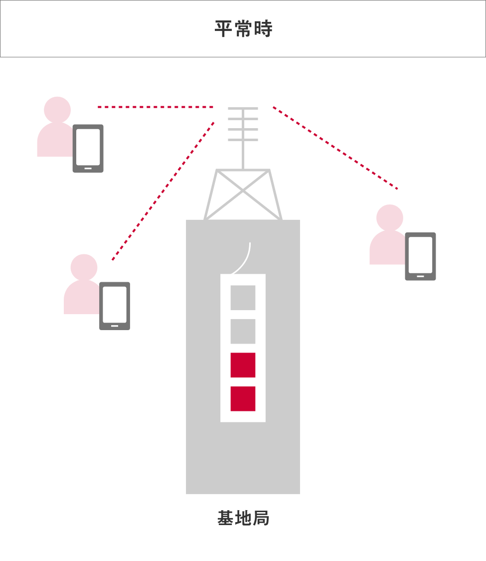 しかしながら、災害発生時などは通常の数十倍にもおよぶ被災地や被災地への通信が集中し、一時的にネットワーク設備の処理能力をオーバーすることがあります。この状態を「輻輳」と呼んでいます。