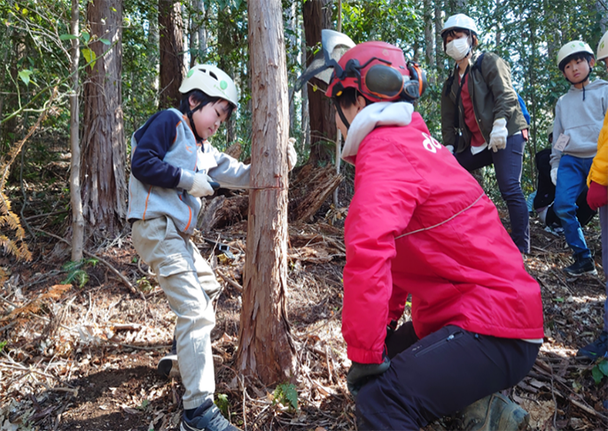 2025年3月には、東京都八王子市にあるドコモ八王子上川の里の森で東京チェンソーズと協力し環境教育プログラム「山あそび体験プログラム、木こりとDIY体験」を実施しました。植林から主伐に至るまでの森の成長過程を林業の仕事と対比した形でパネルを用いて説明するとともに、普段の暮らしでは体験できない木の伐採や、のこぎりなどを使用したDIYの体験を通して、森の役割を理解することができました。「山あそび体験プログラム、木こりとDIY体験」の様子 自社のフィールドを活用し、ステークホルダーのみなさまとの協働や実証の場として役立てる活動