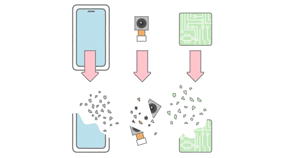 回収されたスマートフォンやタブレットは、ざまざまなパーツに分解しています。
