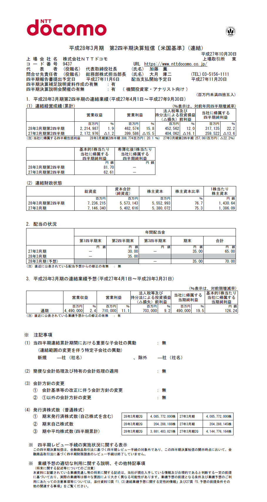 2016年3月期 第2四半期 決算短信