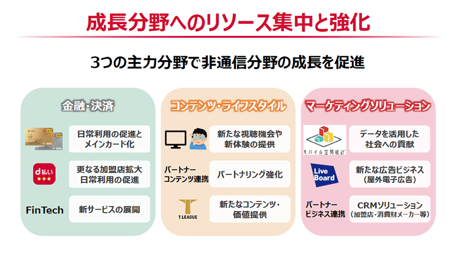 まず、金融・決済サービスは、加盟店拡大とdカード・d払いの日常利用をさらに促進します。また、映像・エンターテインメントなどを中心にコンテンツサービス強化に取り組み、事業の拡大をめざします。さらに、充実した会員基盤を活用し、マーケティングソリューション事業を確立してまいります。dメニュー・LIVE BOARDなど会員属性に応じた広告事業を拡大すると共に、戦略パートナーとのデータ連携によるCRM強化など、データ活用ビジネスを本格的に進めてまいります。