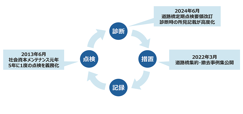 診断、措置、記録、点検の循環図。診断:2024年6月道路橋定期点検要領改訂、診断時の初見記載が高度化。措置:2022年3月道路橋集約・撤去事例集公開。点検:2013年6月社会資本メンテナンス元年5年に1度の点検を義務化。