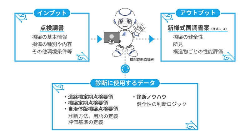 橋梁診断支援AIのインプット:点検調書(橋梁の基本情報、損傷の種別や内容、その他環境条件など)診断に使用するデータ:道路橋定期点検要領、橋梁定期点検要領、自治体版橋梁点検要領(診断方法、用語の定義、評価基準の定義)、診断ノウハウ(健全性の判断ロジック)、アウトプット:新様式国調書案(橋梁の健全性、初見、構造物ごとの性能評価)