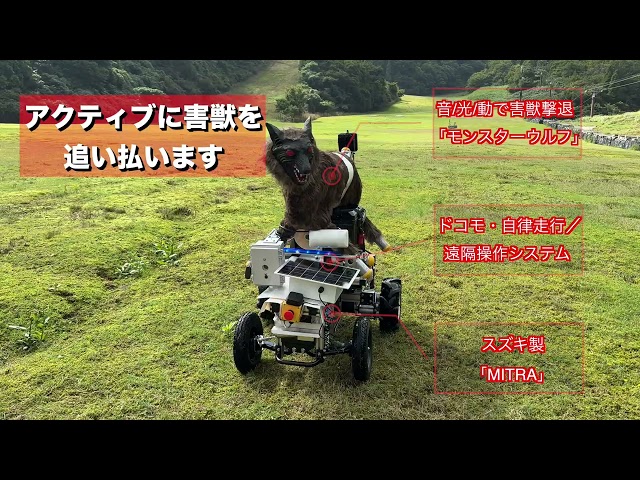 農作物被害をはじめ喫緊の課題ともなっている獣害対策に役立てるため、自動走行する獣害対策ロボットの研究開発を進めています。具体的には、多目的電動台車「MITRA*1」にGNSS/RTKに基づく自動走行機能を実装し、その上に獣害対策ロボット「モンスターウルフ*2」を載せる構成でプロトタイプを開発しています。さらに安全・安定した動作・運用を実現するため、超音波センサに基づく緊急停止や、「docomo MEC」を用いた遠隔監視および遠隔操作といった機能も加え、実証実験を実施しています。当該実験では夜間の自動巡回を数週間行い、カメラに写るシカの個体数を集計し、野生動物の忌避効果を確認しています。