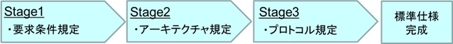 まず実現すべきサービスの「要求条件」を規定し(ステージ1)、次にその要求条件をもとにシステム全体のアーキテクチャを規定(ステージ2)、最後に通信に必要なプロトコル仕様を規定(ステージ3)という流れで進みます。