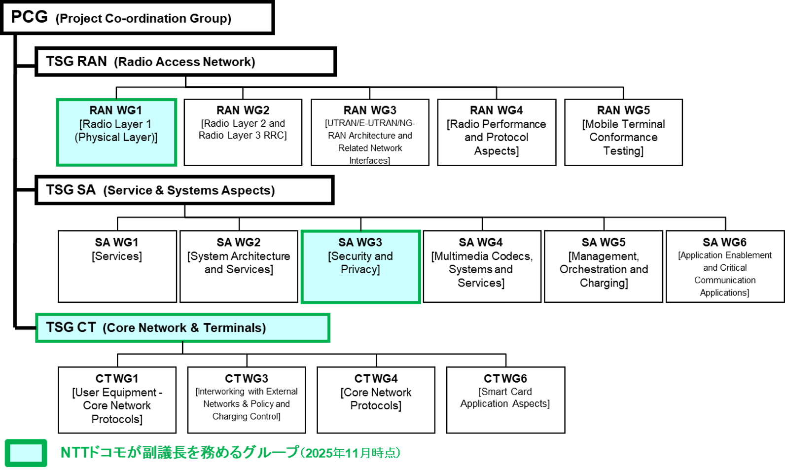 PCGでは、3GPP全体の運営方針の検討と、その配下で技術の検討を行っているTSG(表1)間の連携を調整します。またTSGの配下には、各技術の内容に応じて実際の検討を行う複数のWG(Working Group)が存在します。