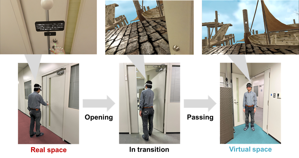 Seamless transition of real and virtual environments has been scientifically proven important for an enhanced virtual reality experience where users feel like they "truly exist within the virtual space". Some commercial entrance/exit systems such as real doors have been realized by smartphones or head-mounted displays as a boundary between real and virtual spaces. There has been no systems where physical doors were used as a boundary, that allow users to operate them to receive multisensory information, such as tactile and auditory feedback. NAIST (Nara Institute of Science and Technology) has focused on the enhancement of user experience through the use of physical doors accompanied by multisensory feedback, faithfully mirroring user actions, and has scientifically validated this approach *. Based on NAIST's scientific findings, NTT DOCOMO has developed a new technology to dynamically recognize hand and door movements, realizing a system that easily enhances the user experience.