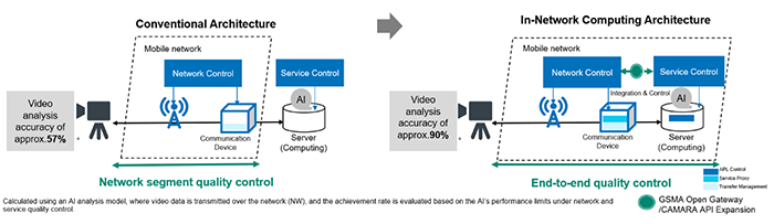 During this demonstration, the GSMA-defined Open Gateway*3 / CAMARA API*4 was utilized to develop and implement technologies for controlling network routing based on mobile network conditions. Additionally, new technologies were developed and implemented that enable connection and coordinated control between user communication devices and servers positioned near the user. These will allow on-demand computing services to be provided according to user needs. As a result, the demonstration confirmed that quality requirements spanning both network and computing domains can be rapidly achieved through API control based on user requests. Application of the INC architecture in real-time video data transmission and AI analysis showed that it could achieve accuracy of 90%, which is the AI model's performance limit.