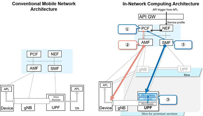 Traditionally, mobile networks have focused on managing device connectivity and mobility, primarily handling lower-layer connections from user terminals, through the mobile communication system, to external networks. However, with the evolution and expansion of high-performance services such as XR and edge computing, there is growing demand for higher-layer or application-specific requirements in mobile networks, a trend that is expected to become even more pronounced in the 6G era. Against this backdrop, NTT and DOCOMO have proposed an INC architecture that integrates computing functions into the User Plane Function (UPF).*6 Using an API to interface with core network control, NTT and DOCOMO explored methods to simultaneously set up computing functions and control device network connectivity, identifying necessary specification enhancements.