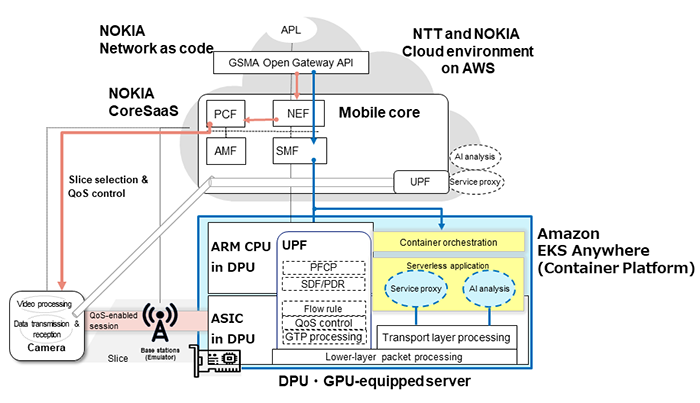 The proof of concept was conducted by deploying 3GPP-compliant mobile core network on Amazon Web Services (AWS). This network was managed under Nokia's product, a Network as Code platform designed for API management and routing, as defined in GSMA Open Gateway and Linux Foundation CAMARA projects. Within this mobile core network, a new control function was introduced to handle the mobile core network, enabling it to configure communication routes to the ISAP platform in response to computing service activation requests received via the Network as Code platform. An integrated control mechanism was implemented on a container platform equipped with accelerators*7 such as DPUs and GPUs. This mechanism simultaneously activates both communication and computing services when a computing service startup request is issued.