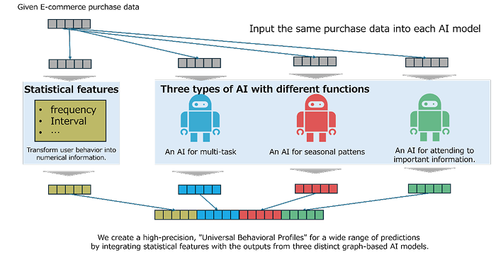 DOCOMO developed a hybrid solution that combined statistical purchase features with three graph-based AI models, as illustrated in Figure 2. This approach was based on the hypothesis that by systematically organizing and integrating diverse user behavior data, it would be possible to capture users' essential characteristics that could be commonly applied across different tasks—such as churn prediction and purchase prediction.
