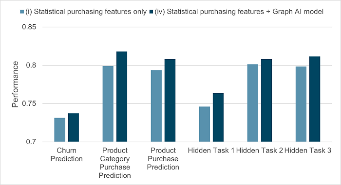By combining the statistical purchase features with the outputs of these three graph-based AI models in a hybrid approach, DOCOMO confirmed significant improvements in predictive accuracy across all six tasks compared with using statistical features alone (see Figure 3)