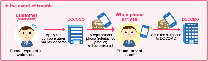 If an issue occurs, a replacement phone is offered as soon as possible. It also offers support for the fees charged when a defective device is repaired or data is recovered by DOCOMO.