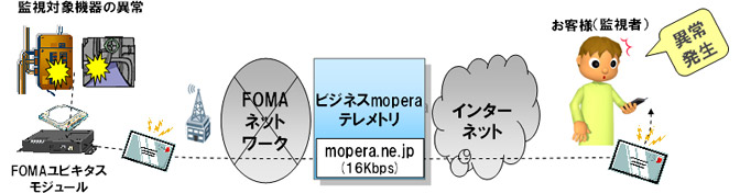 「ビジネスmoperaテレメトリ」とは、FOMAユビキタスモジュールやDoPaユビキタスモジュールを利用し、メールで異常時通知を行うなど、監視機器からの情報通知を目的としたテレメトリングを行っているお客様専用のISPサービスです。