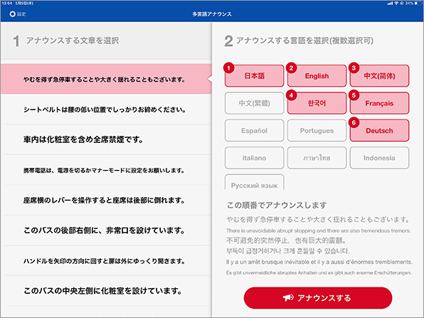 選択した文章を複数の言語で連続して読み上げるモードです。災害時などに多言語で多数のお客さまに向けて発信する際にも利用可能です。